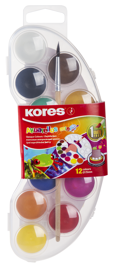 Akvarellvärvid 12 värvi KORES Mini, 25mm, pintsel, riputuspakis
