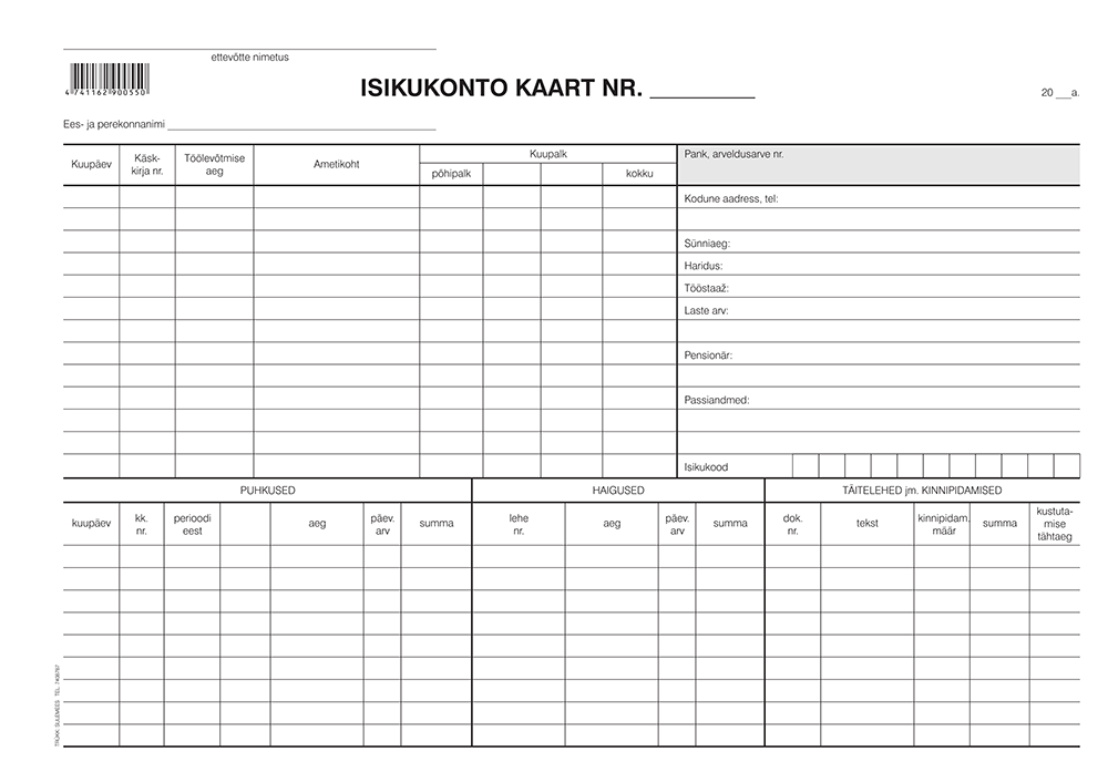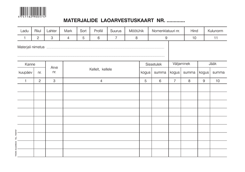 Blankett Materjalide laoarvestuskaart A5, laiuti