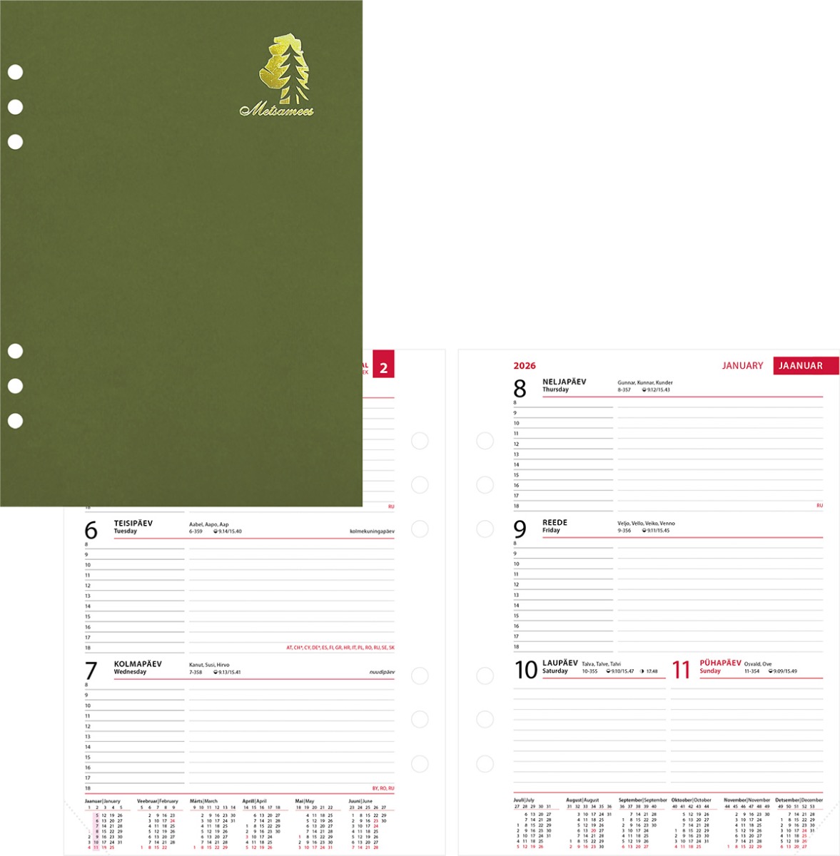 Ettevaatust ! Eriline augustus. Kontrolli hoolikalt enne tellimist. 6 auguga kalendrisisu metsamehe kalendrile. Nädala- ja horisontaaljaotus. Aukude kaugused tsentrist tsentrisse 19-19-50-19-19 mm. Lk. mõõt 142×202 mm. Kalendaarium sisaldab riigipühi, riiklikke ja rahvakalendri tähtpäevi, lipupäevi, nimepäevi, 42 riigi pühi lühenditena, päikese tõusu ja loojangu aegu, kuu faase, aastaaegade alguseid, käesoleva ja järgneva aasta plaane, aasta tabelkalendreid, foneetilisi tähestikke, mõõtühikute teisendamise tabelit ja tabeleid enamuse maailma riikide telefoni koodide, valuuta, ajavahe jne kohta. Lisad: kalastuskalender, jahikalender, metsakahjurputukate kalender, kasvava metsa mahutabel, ümarpuidu mahutabel, laudade ja prusside mahutabel.