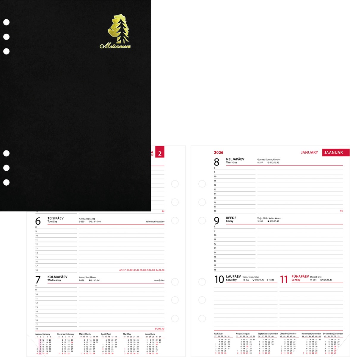 Kunstnahast kaantega 6 rõngaga nädalaakalender. Rõngaste kaugused tsentrist tsentrisse 19-19-70-19-19 mm. Lk. mõõt 142×202 mm. Trukiga kinnitus. Esikaane siseküljel 7 krediitkaarditaskut ja tõmblukuga tasku. Tagakaane siseküljel märkmeploki tasku ja pliiatsihoidja. Kalendaarium sisaldab riigipühi, riiklikke ja rahvakalendri tähtpäevi, lipupäevi, nimepäevi, 42 riigi pühi lühenditena, päikese tõusu ja loojangu aegu, kuu faase, aastaaegade alguseid, käesoleva ja järgneva aasta plaane, aasta tabelkalendreid, foneetilisi tähestikke, mõõtühikute teisendamise tabelit ja tabeleid enamuse maailma riikide telefoni koodide, valuuta, ajavahe jne kohta. Lisad: kalastuskalender, jahikalender, metsakahjurputukate kalender, kasvava metsa mahutabel, ümarpuidu mahutabel, laudade ja prusside mahutabel. Komplekti kuulub must plastregister, telefonilehed, ruudulised märkmelehed, visiitkaarditaskud.