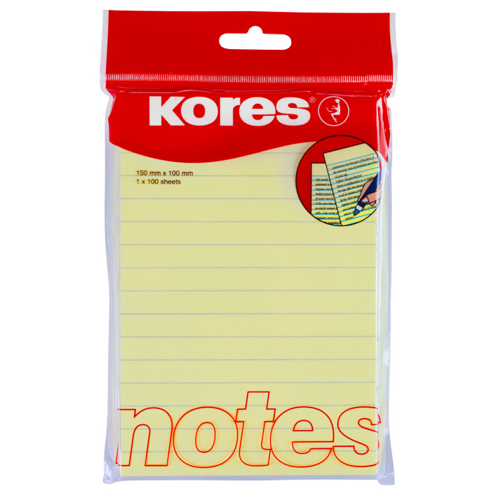 Märkmepaber KORES 100x150mm kollane jooneline, 100 lehte, riputuspakis