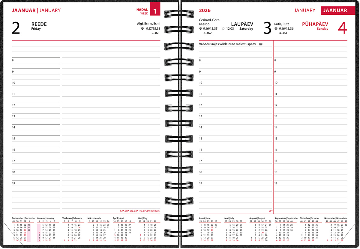 Kõvade kaantega spiraalköites märkmik, lk mõõt 142×202. Kalendaarium sisaldab riigipühi, riiklikke ja rahvakalendri tähtpäevi, lipupäevi, nimepäevi, 42 riigi pühi lühenditena, päikese tõusu ja loojangu aegu, kuu faase, aastaaegade alguseid, käesoleva ja järgneva aasta plaane, aasta tabelkalendreid, foneetilisi tähestikke.