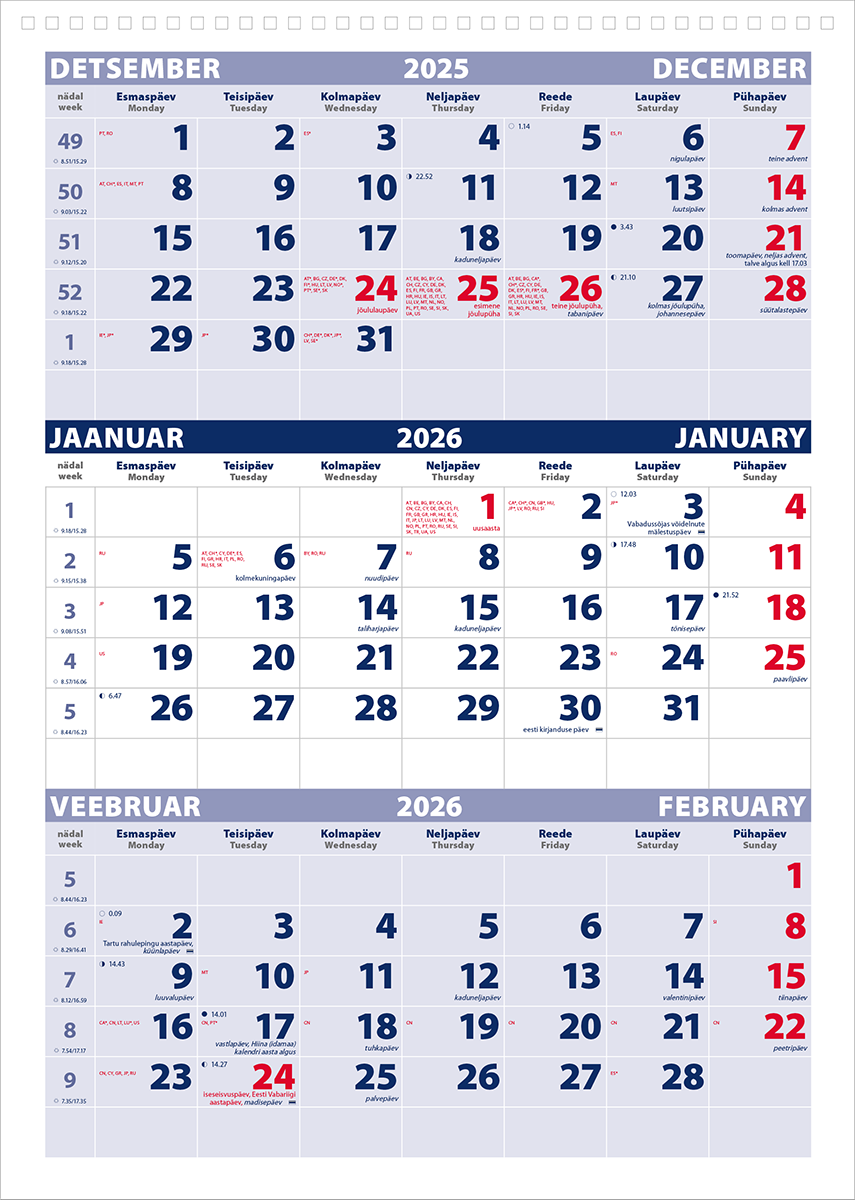 Seinakalender Trio põhi, (sinine-punane) augustatud tagapapita