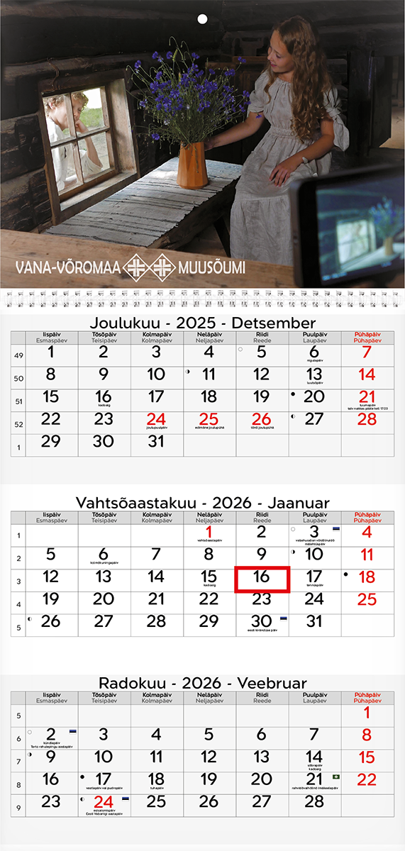 Kuuvaatega seinakalender. Avatud mõõt koos pildiga 297x425mm. Punane staatiline kuupäevamärkija. Kalendaarium sisaldab riigipühi, riiklikke ja rahvakalendri tähtpäevi, lipupäevi, 42 riigi pühi lühenditena, päikese tõusu ja loojangu aegu, kuu faase, aastaaegade alguseid. Eelmine ja järgnev kuu alati avatud. Päeva ja kuu nimed võru ja eesti keeles. Iga kuu juures on üks võrukeelne rahvatarkus. Tellides oma pildi ja/või reklaamribaga hind muutub.