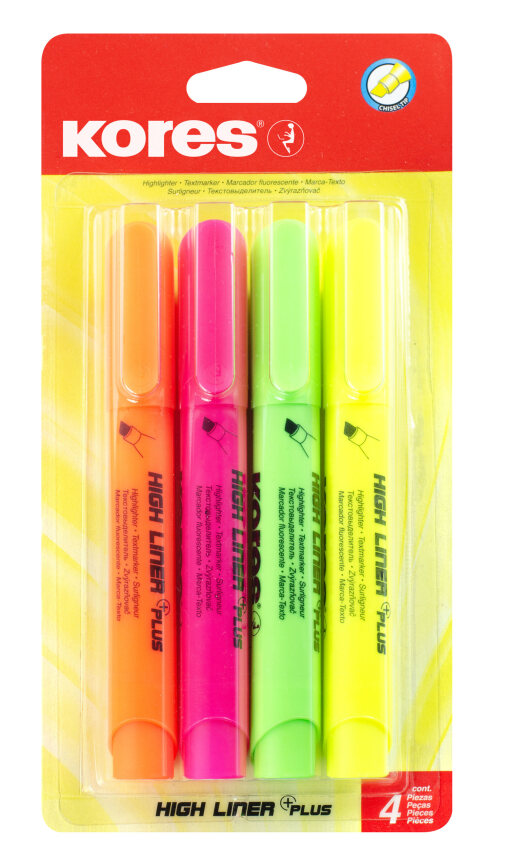 Tekstimarkeri komplekt KORES High Liner Plus, 4 värvi riputuspakis