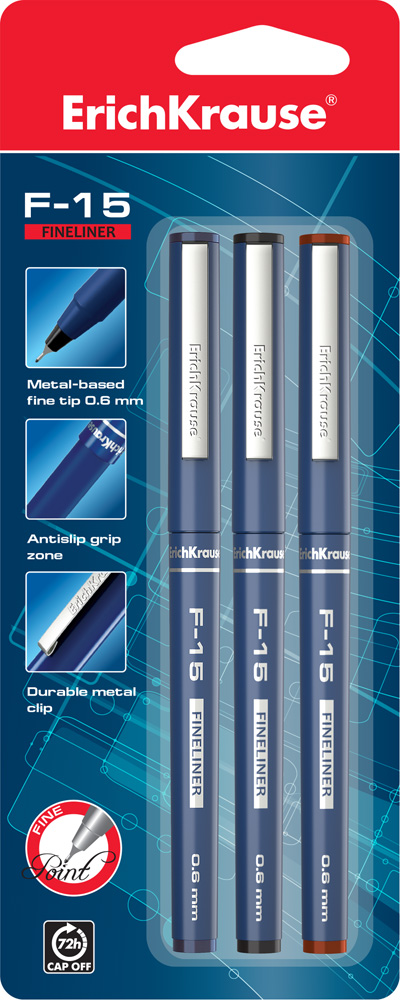Tindipliiats Fineliner F-15 Classic Stick 0.6, vee baasil, 3 (si,mu.pu) riputuspakis