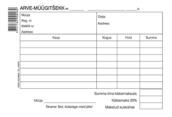 Blankett Arve-müügitšekk A6 laiuti, 100 lehte, paber